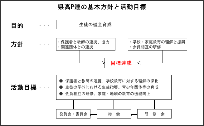 21世紀を担う、たくましい創造力と心豊かな人間性を持つ生徒を育成するために、 学校及び家庭における教育に関し理解を深め、その教育の振興に努め、さらに、生徒の校外における生活の指導、 地域における教育環境の改善・充実を図り、会員相互の学習その他必要な活動を行うことを基本方針とする。